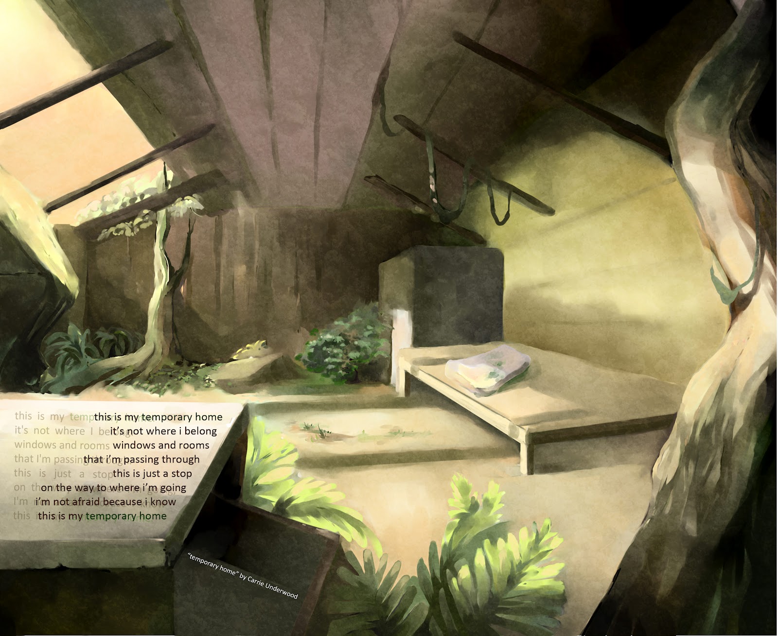 This is a digital painting I did for class. The assignment was to pick a set of lyrics/story/poetry and then create an interior scene based on that. I used lyrics from Carrie Underwood's "Temporary home", I wanted to show an abandoned room, left alone for years so vegetation started growing. I should've made it more cluttered and have plants invade the space a bit more but for the time being I'm pretty pleased with it.